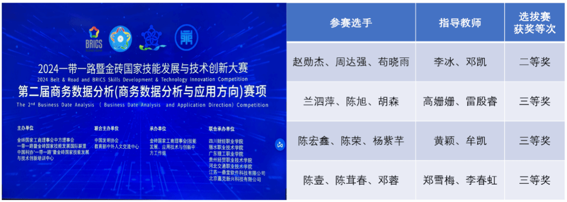 信息技术系学子在2024年“一带一路”暨金砖大赛之第二届商务数据分析选拔赛中斩获佳绩2024年5月26日,备受瞩目的“一带一路”暨金砖大赛之第二届商务数据分析选拔赛圆满落幕。万象城信息技术系学子在激烈的竞争中脱颖而出,凭借扎实的专业知识和出色的实践技能,最终斩获二等奖1个、三等奖3个。本次比赛,学院信息技术系精心选拔了赵勋杰、周达强等12名大数据技术专业学生,组成4支实力强劲的参赛队伍。在系部及实践教学中心组成的教师教学团队的悉心指导和大力支持下,...