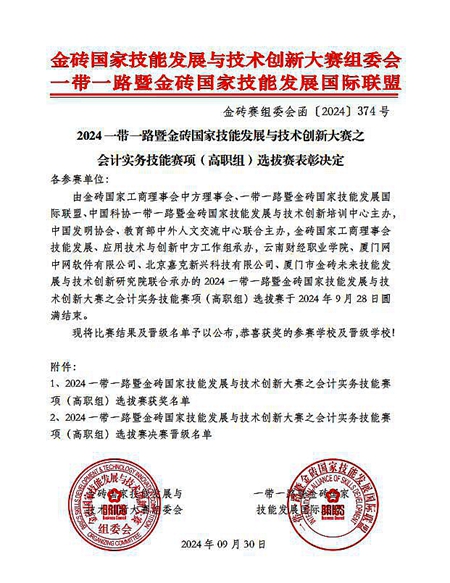 9月28日,由万象城会计系杜晓玲、余欣悦老师指导的代表队从全国644支参赛队伍中脱颖而出,荣获2024“一带一路”暨金砖国家技能发展与技术创新大赛之会计实务技能赛项(高职组)选拔赛全国二等奖,并以四川省第一名的成绩晋级全国总决赛。“一带一路”暨金砖国家技能发展与技术创新大赛会计实务技能赛项由金砖国家工商理事会中方理事会、“一带一路”暨金砖国家技能发展国际联盟、金砖国家技能发展与技术创新大赛组委会主办。该赛事自创办以来,...
