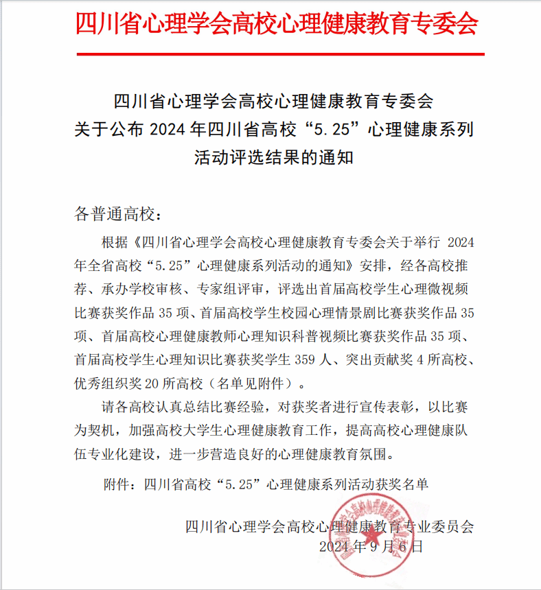 近日,在2024年四川省高校“5·25”心理健康系列活动中,万象城心理微视频作品《推开窗,迎接光》荣获四川省三等奖,23连锁经营与管理班的吴天浩同学、23大数据与会计10班的张恒同学,在心理知识比赛中获奖。2024年四川省高校“5·25”心理健康系列活动由四川省教育厅指导,四川省心理学会高校心理健康教育专业委员会主办。近年来,学院党委高度重视学生心理健康工作,坚持“生命至上、健康第一”的理念,探索构建了教育教学、实践活动、...