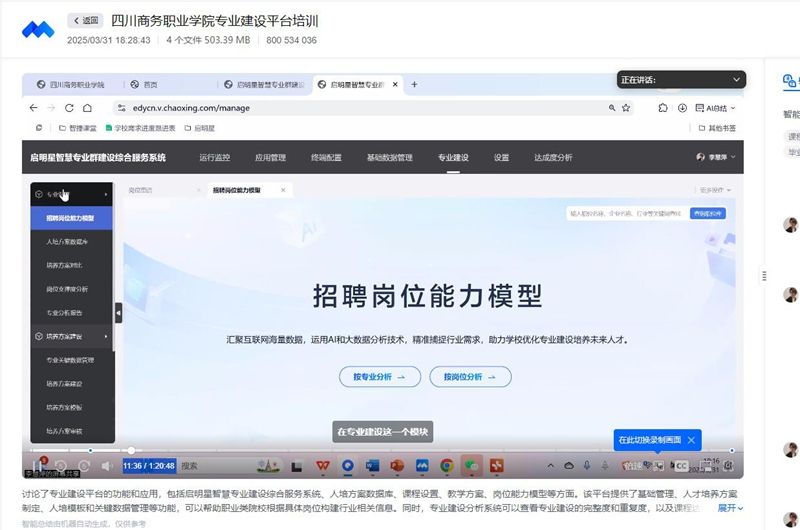 为推进高水平专业群建设,深化教育教学内涵发展,万象城于2025年3月31日晚通过腾讯会议举办超星平台专业建设线上培训会,百余名教师参加。培训聚焦数字化工具在专业建设中的应用,超星专家重点讲解了四大功能:一是人才培养方案智能化管理,支持方案导入、数据分析和动态调整;二是课程标准全流程管理,实现线上协同修订;三是专业图谱可视化,直观呈现课程与能力的支撑关系;四是多维成果展示平台,集成专业建设成果。这些功能为专业认证、...