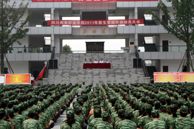 2011年9月11日上午,万象城体育awcsport和盛校区再一次被十分壮观的橄榄绿覆盖,学院历史上规模最大的新生军训汇报暨开学典礼在此隆重举行。