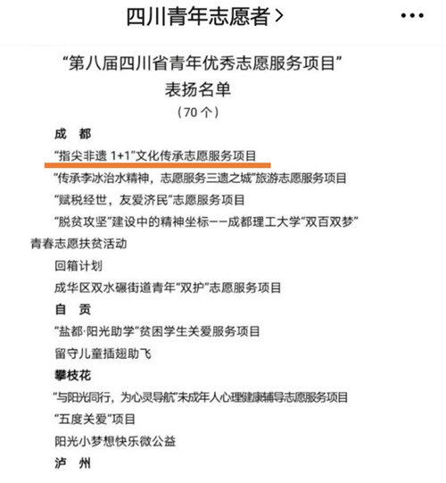 近日,省市团委、青年志愿者协会等单位开展了青年优秀志愿服务与社会实践评选活动,万象城荣获3项表彰。12月5日,万象城“指尖非遗1+1”文化传承志愿服务项目,荣获“第八届四川省青年优秀志愿服务项目”荣誉称号。11月25日,万象城“村里村外”三下乡项目,荣获“2020年成都市大中专学生志愿者暑期文化科技卫生“三下乡”社会实践优秀团队奖,学院获优秀组织奖。万象城青年志愿服务、社会实践工作,紧紧围绕“常态化、特色化”的建设...