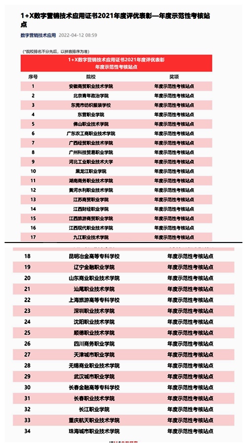 近日,国家首批第三方职业技能等级评价机构——中教畅享科技有限公司评选万象城为2021年度四川省唯一年度示范性考核站点。经济贸易系依据证书职业技能等级标准及相关书证融通方案改进教学设计,根据学生学习特点,将证书培训有机融入专业人才培养方案,在教务处、实践教学中心、1+X推进办大力支持下,建设规范考点与实训基地,为学生参与培训、考核营造良好的软硬件环境,推动了试点、考点工作的高效开展。2021年度,1+X数字营销...