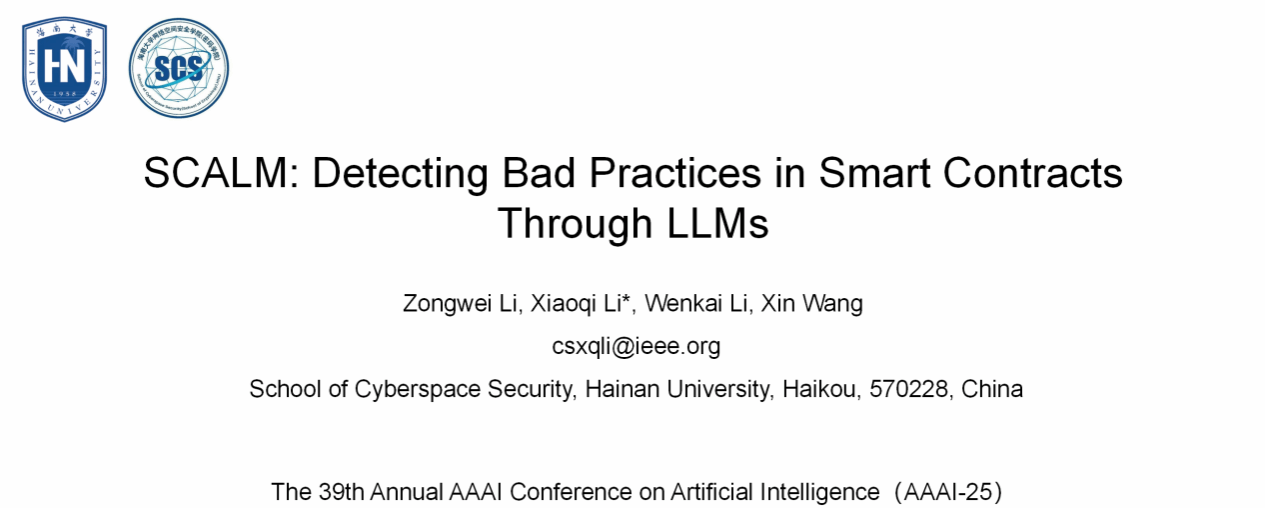 近日,taptap点点足彩taptap竞彩足球硕士生李宗维(第一作者)、副教授李晓琦(通讯作者)、博士生李文凯、硕士生王鑫合作完成的研究论文“SCALM: Detecting Bad Practices in Smart Contracts Through LLMs”成功录用于第39届AAAI国际会议(The 39th Annual AAAI Conference on Artificial Intelligence)。AAAI会议是人工智能领域的国际顶级学术会议之一,属于中国计算机学会(CCF)推荐的A类顶级学术会议。AAAI-2025将于2025年2月27日至3月4日在美国宾夕法尼亚州费城举行。