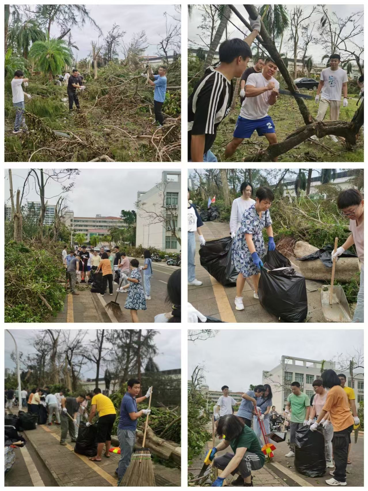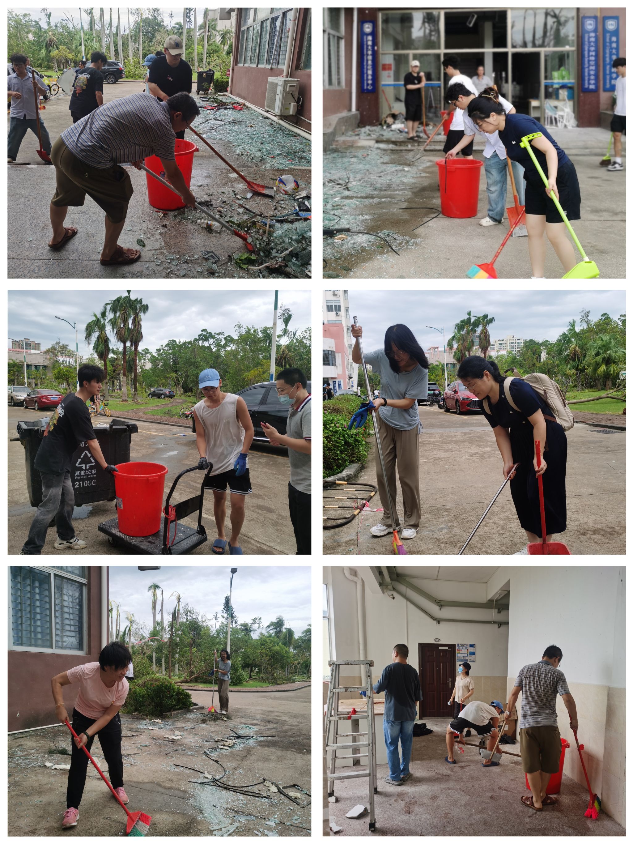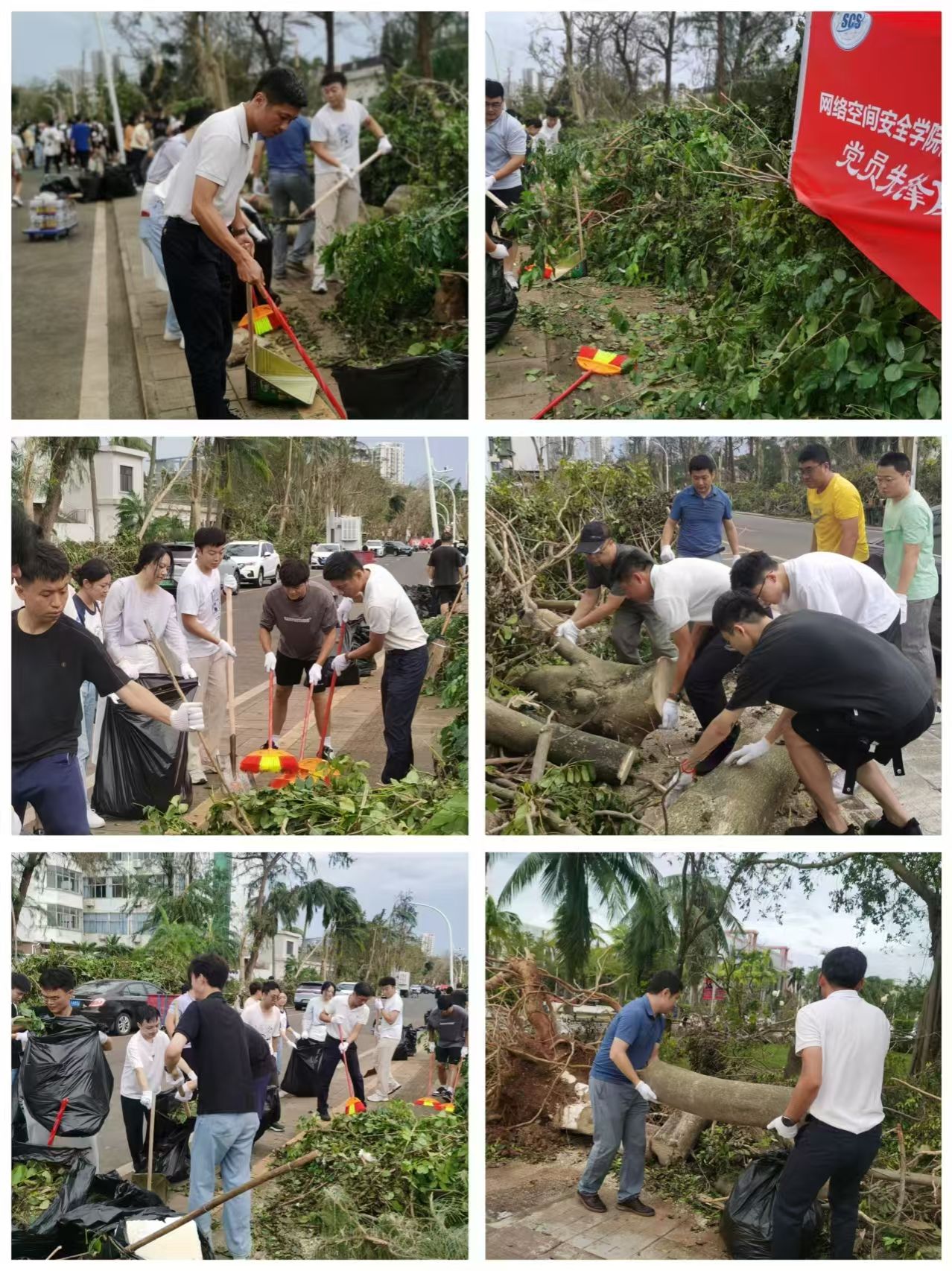 在领导小组的指挥下,党员先锋队冲锋在前,力除台风造成的安全隐患。师生志愿者分成4个小组,有序投入灾后恢复工作。