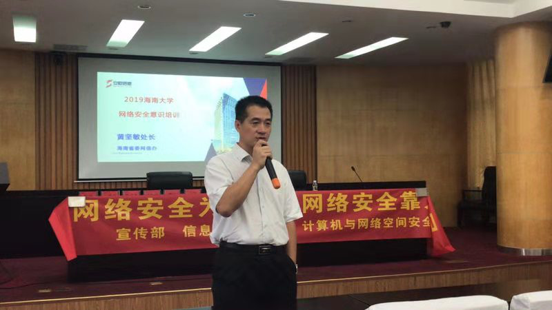 在本次网络空间安全宣讲活动中,我们有幸邀请到了海南省委网信办网络安全处处长黄坚敏、安恒信息技术股份有限公司主任陈宇乾、奇安信渠道技术总监田海燕等专家来taptap点点足彩进行网络空间安全的知识讲座。