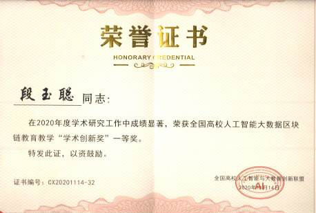 11月14日,“2020第三届全国高校人工智能大数据区块链教育教学创新论坛”在北京召开。会上,全国高校人工智能与大数据创新联盟向来自全国的49位教师、15所高校颁发了人工智能大数据教育教学“创新奖”,taptap段玉聪教授荣获全国高校人工智能大数据区块链教育教学“学术创新奖”一等奖。