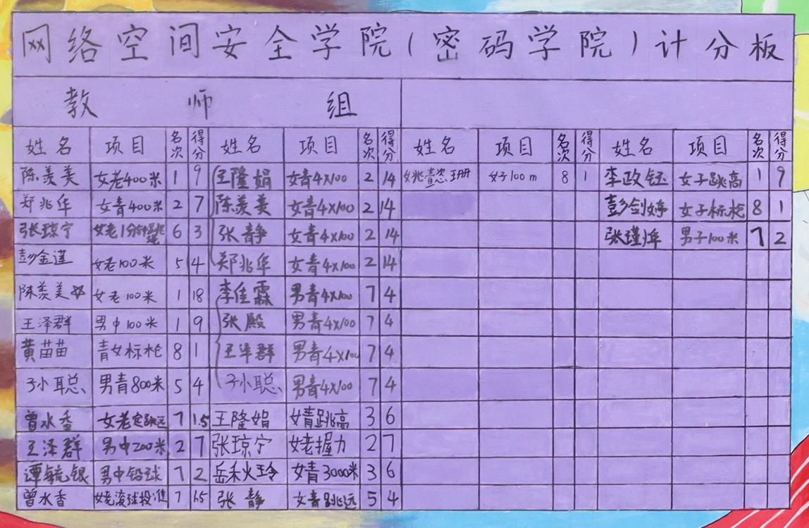 taptap师生在此次校运会上表现突出。taptap现有在岗教职工44人,参赛人数24人,过半教职工参与进来,将竞技赛场上拼搏的精神发扬的淋漓尽致。陈羡美老师宝刀未老,在赛场上大放异彩。她不仅在女子老年400米项目中夺得第一,并在女子老年100米项目中打破了校记录,斩获冠军。由陈羡美、王隆娟、郑兆华、张静组成的女子接力队在女子4*100米项目上夺得亚军,与冠军仅差0.19秒!男子教工组4*100米项目也获得第七的好成绩。taptap王泽群老师实力也不可小觑,摘得男子中年100米项目的桂冠,并在男子中年200米项目中取得亚军。同时,taptap师生在其他项目中也大放异彩。教师组的高水平发挥使taptap夺得教职工组团体第五名、教职工组女子团体第六名的喜人成绩。学生组同样有出色的表现,其中李政钰同学在女子跳高项目中脱颖而出,一举夺冠。