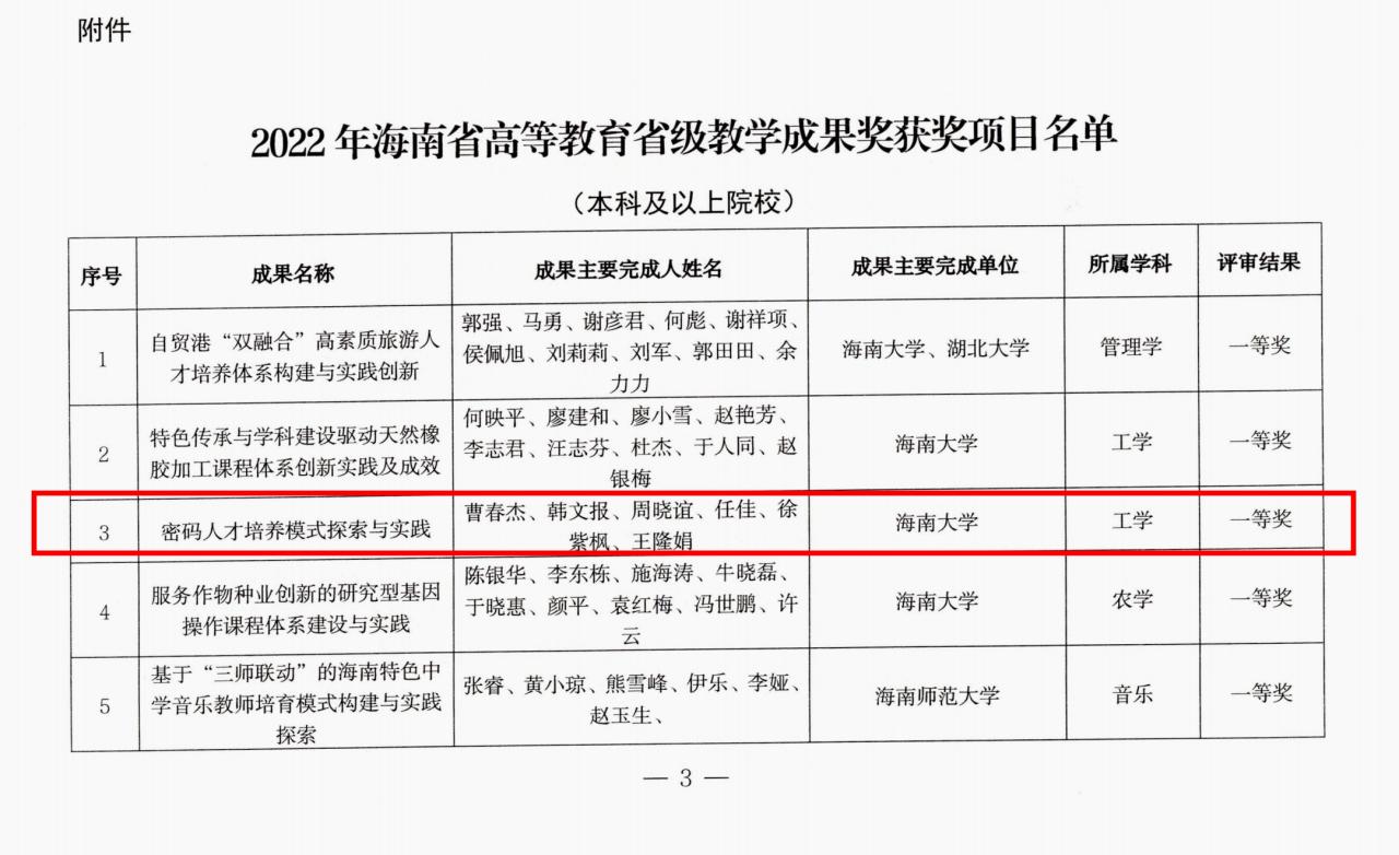 近日,海南省教育厅公布了2022年高等教育省级教学成果奖评审结果,taptap《密码人才培养模式探索与实践》项目荣获省级教学成果奖(本科及以上院校组)一等奖,完成人:曹春杰、韩文报、周晓谊、任佳、徐紫枫、王隆娟等。