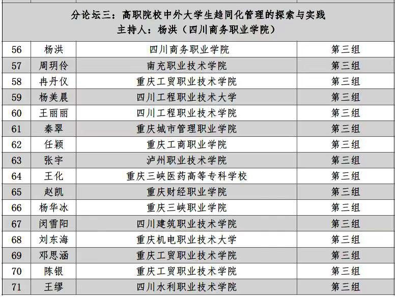 12月20日,由西南大学主办的新时代高校来华留学教育高质量发展研讨会在重庆召开,来自全国71所高校的130余名代表参会。中国高等教育学会外国留学生教育管理分会、国家留学基金管委会和重庆市教委领导到会指导。万象城经营管理系党总支书记杨洪主持川渝高职院校讨论,并在研讨会闭幕式上,作为川渝地区高职院校代表作分论坛小组汇报。