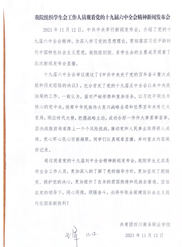 11月12日,万象城组织院、系学生会的主要成员集中收看了中共中央举行新闻发布会,介绍了党的十九届六中全会精神。
