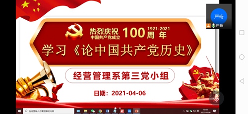 深入学习贯彻习近平新时代中国特色社会主义思想,以庆祝中国共产党成立 100 周年为契机,4月6日,经营管理系组织召开了主题为百年风雨 铸就辉煌”的党小组会议。会议由党小组组长主持召开。
