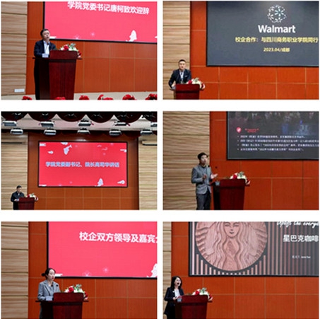 沃尔玛(中国)投资有限公司成都分公司华西区区域人力资源经理钟波、江苏京东信息技术有限公司京东零售集团校企合作西南区负责人金星星、星巴克咖啡有限公司中西区人力资源总监范文兰等到会。学院党委书记唐柯、院长高司华出席仪式并分别致辞和讲话,其他院级领导、各部门负责人、教师和学生代表参加会议。仪式由学院副院长康璐主持。