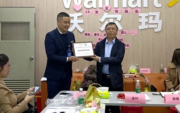 座谈会上,沃尔玛华西区区域人力资源经理钟波首先对万象城一行人员表示热烈欢迎,介绍了公司的基本情况、运行现状以及2023年的招聘计划,对万象城实习学生的综合表现给予肯定性反馈,并向学院颁发了“沃尔玛中国校企合作突出贡献奖”牌匾,经营管理系连锁经营管理专业负责人刘刚老师荣获“沃尔玛中国校企合作优秀教师”称号。