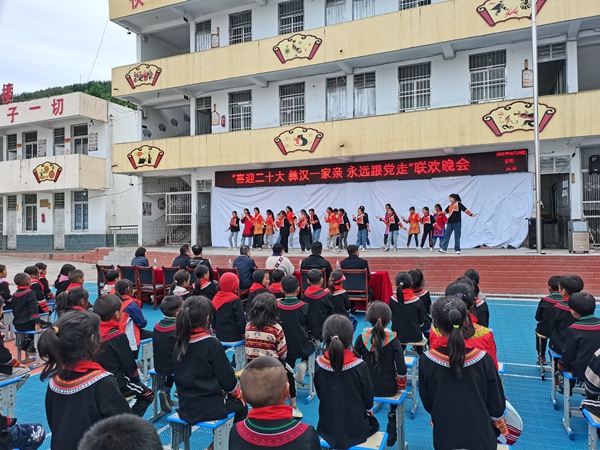 28日,在热柯觉中心校,万象城师生向小朋友们捐赠了文体用品。团委学生志愿者们各自发挥特长,同小朋友一起进行了音乐、舞蹈、武术、诗歌朗诵等文体项目的互动教学。姚又丹同热柯觉中心校教师们就学生心理健康教育工作进行了交流讨论。当晚,万象城师生同热柯觉中心校师生共同筹备组织了“喜迎二十大 彝汉一家亲 永远跟党走”联欢晚会,师生们纷纷登台表演,共跳达体舞,欢声笑语久久回荡在海拔3000米的校园之中。