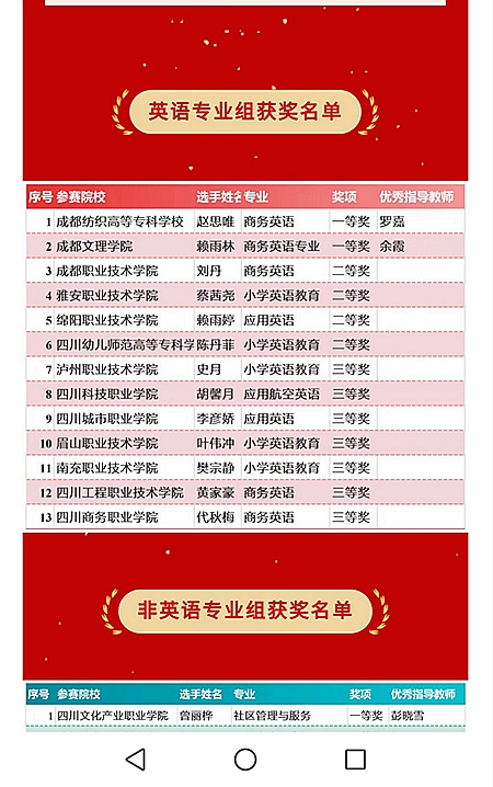 11月10-11日,由四川省教育厅主办的2022年四川省“高教社杯”大学生英语口语技能大赛在成都纺织高等专科学校举行,来自全省53所职业院校的53位选手参加了比赛,万象城商务英语专业代秋梅同学代表学院参赛。代秋梅同学凭借扎实的专业功底和精彩的现场表现最终获得英语组三等奖。