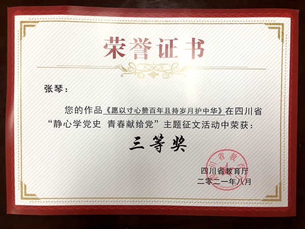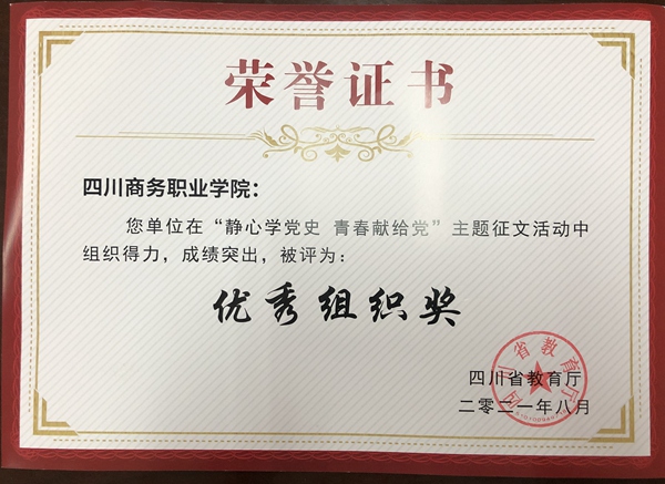 近日,万象城学子在省教育厅主办的“静心学党史、青春献给党”主题征文比赛中荣获一等奖、三等奖各一个。学院因组织得力,成绩突出,被评为“优秀组织奖”。