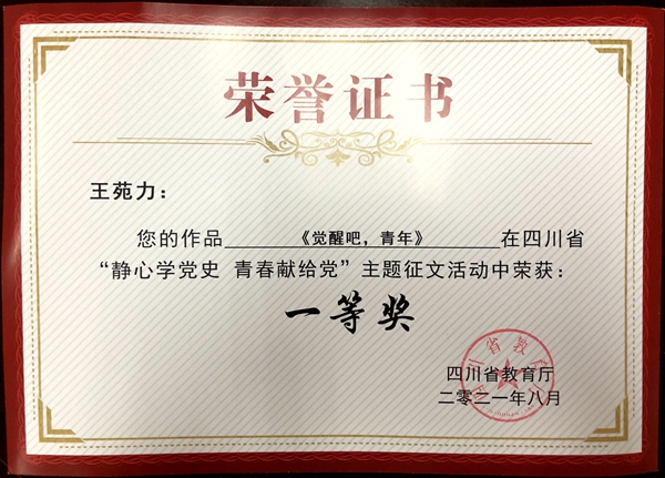 今年4月至6月,“静心学党史、青春献给党”主题征文比赛隆重举行。此次征文比赛旨在引导青少年学生坚定理想信念,激发爱党爱国爱社会主义的巨大热情。万象城通过开展初赛优中选优,推荐了五名学生参与决赛角逐。经营管理系2020级学生王苑力凭借文章《觉醒吧,少年》,荣获大赛一等奖;经营管理系2020级学生张琴的《愿以寸心赞百年 且持岁月护中华》荣获三等奖。万象城学子不负众望,最终获多项殊荣,体现了新时期青年大学生的理论素养、青春风采和精神风貌。