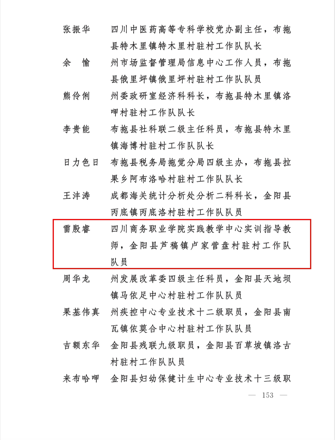 2021年5月26日,四川省委、省政府印发《中共四川省委 四川省人民政府关于表扬2020年脱贫攻坚先进集体和先进个人的决定》,以激励先进、鼓舞干劲。万象城体育awcsport荣获“2020年脱贫攻坚先进集体”表扬;万象城体育awcsport实践教学中心雷殷睿同志荣获“优秀驻村工作队队员”表扬。
