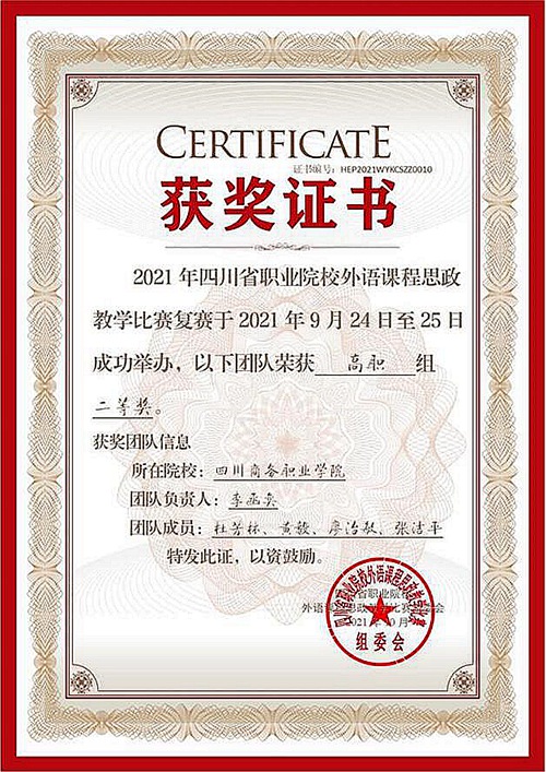 9月25日,在四川省教育厅主办的“2021年四川省职业院校外语课程思政教学比赛”中,经学院遴选推荐、大赛组委会组织专家评审,省级现场复赛,共16支高职院校参赛团队获得省赛单项奖,获奖率为36%。由万象城经济贸易系英语教师李函奕负责的团队获省赛二等奖。