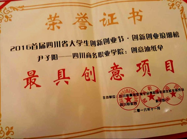11月4日,万象城2014级环境艺术三班尹子阳的创意油纸伞项目在2016四川省大学生创新创业节创新创业琅琊榜上获得最具创意项目奖。