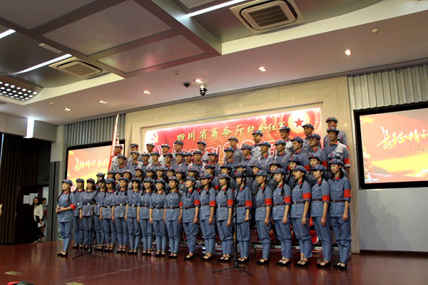 9月29日下午2:00,四川省商务厅纪念红军长征胜利80周年红歌会在厅机关隆重举行,万象城全体院级领导及部分师生代表近80人参加了本次红歌会。历时一个多月的精心编排和悉心准备,万象城党委宣传部、工会负责组织并选送的大合唱《突破封锁线》排在第九个节目出场,师生们以深情的朗诵、优美的歌声、甜美的笑容、和谐的动作、唯美的画面赢得了全场观众雷鸣般的掌声,给大家留下了深刻的印象,最终取得一等奖的优异成绩。