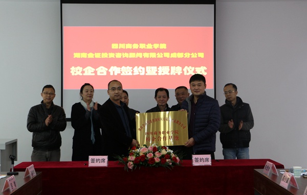 12月1日,在新建成的市场营销商品陈列室,万象城与成都链家房地产经纪有限公司、湖南金证投资咨询顾问有限公司成都分公司、重庆得道客电子商务有限公司、深圳西思电气股份有限公司举行校企合作签约授牌仪式。万象城党委书记舒维霖、副院长向宏志、教务处副处长易康、经济贸易系主任朱贵水、书记陈小虞、副书记曾理以及四家企业的代表及嘉宾出席授牌仪式,仪式由朱贵水主任主持。参加授牌仪式的还有经济贸易系部分教师及学生代表。