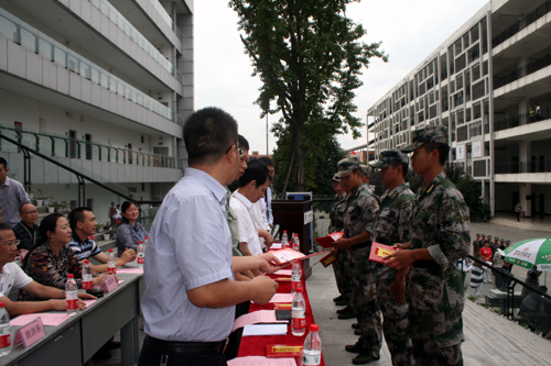 在嘹亮的军歌声中,军训结训典礼拉开了序幕。党委书记舒维霖同志检阅了军训方队,军训新生们组成的分列式方阵,喊着嘹亮的口号,迈着矫健的步伐,依次经过主席台进行分列式表演。此后,军事科目分队汇报表演亦齐齐亮相:虎虎生威的擒敌拳、英姿飒爽的扑伏刀、整齐划一的队列表演、特色鲜明的“三防”急救、浓浓情意的“感恩的心”手语表演......副院长郎松亭同志宣读了军训优秀教官及优秀学员的表彰决定,表彰了9名教官和209名优秀学员。出席领导为优秀教官和优秀学员代表颁发荣誉证书。学院党委书记舒维霖同志作了军训总结讲话,他鼓励新生树立远大理想,秉承学院校训传承学院精神,不断进取,书写自己的辉煌,为人生添彩!