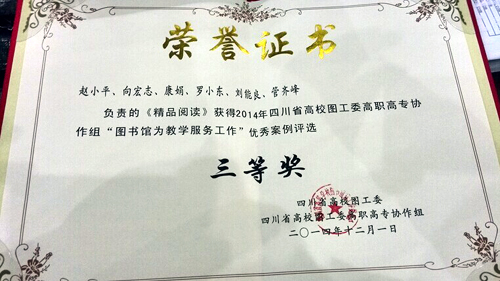 12月4日,四川省高校图工委高职高专协作组召开2014年年会暨“图书馆服务教学”研讨会。万象城 “图情信息——精品推送”工作获得了 “图书馆为教学服务工作”优秀案例评选三等奖。