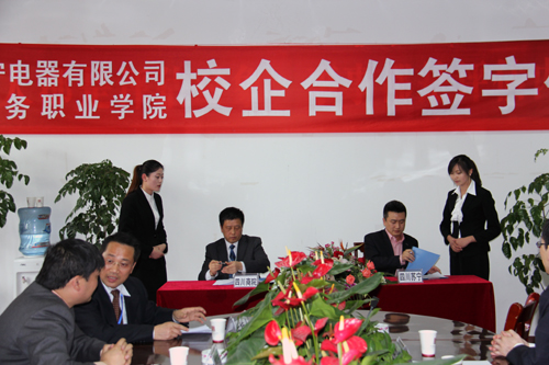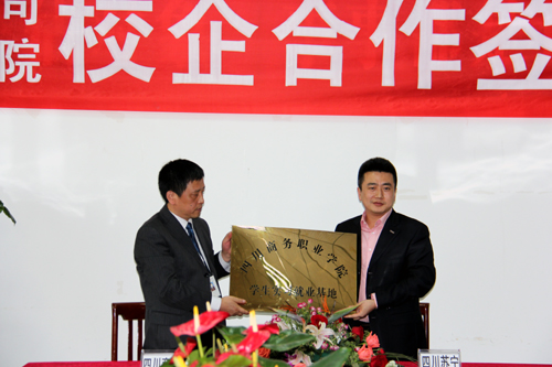 高院长首先代表学院对苏宁电器顾总一行表示了热烈欢迎,并热情介绍他对苏宁电器品牌的忠爱、学院的发展历程、学院在人才培养工作中所取得成就及今后的发展思路;接着苏宁电器顾总诚恳地表示了与学院合作的诚意,介绍了苏宁电器作为中国3C家电连锁零售企业领先者,中国连锁百强之首、国内大型上市优秀企业创立21年来的发展理念以及目前的企业规模、基本业务及当前与院校合作的基本情况;来自09物流专业的徐霞同学代表在苏宁实习的同学发言,介绍她个人在苏宁的学习成长经历及个人的收获,并期待学院能够与苏宁更深层次地合作;最后,高院长与顾总分别代表四川商院与苏宁电器现场签订校企合作办学协议,并相互授予:苏宁电器成为万象城学生“实习就业基地”,万象城成为苏宁电器“员工培训基地”。