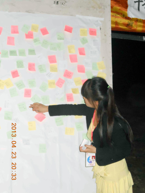 本次活动以“生命如花,因爱绽放”为主题邀请了一位雅安籍同学作为代表作了简短的发言,呼吁大家为雅安祈福并为在此次地震中离去的同胞默哀。全体同学手捧蜡烛,围在一起唱起了祈福歌《祝你平安》,此歌包含了所有同学的祝福,希望雅安人民能够坚强的站起来,走出阴影,重建美好家园。最后同学们在心愿墙上写出自己的心愿贴,同学们用最朴实的文字表达了我们最诚挚的祝愿,愿“芦山常在,雅安永安”。