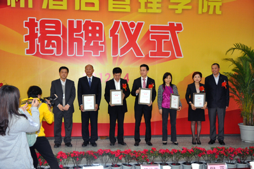 会上呙相林副巡视员为“廊桥酒店管理学院”揭牌,高力平院长和倪平董事长为学院董事会成员颁发了聘书。