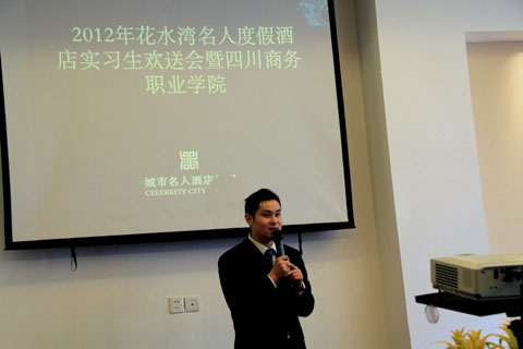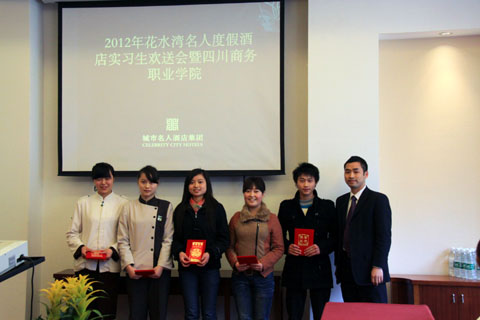 2012年2月22日下午3点在南京厅举行花水湾名人度假酒店为万象城体育awcsport假期勤工俭学同学们举办了欢送会,出席会议的有酒店总经理,人力资源部总监,餐饮部、管家部、四季温泉谷和前厅部负责人。