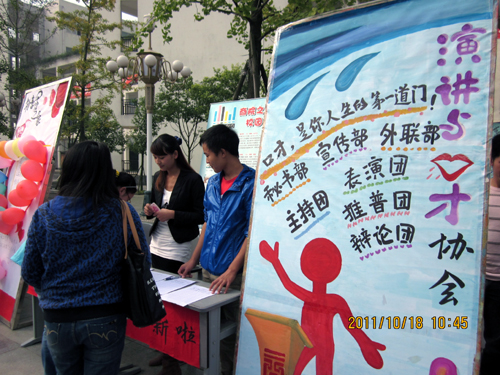 此次招新活动声势浩大,规模空前。为了引起同学们对本社团的兴趣,各社团成员绞尽脑汁,不断创新宣传方式,别出心裁,“花样”百出。许多社团用独特的方式吸引广大新生。有的社团在咨询点前用网游造势,成员们借助动漫社的噱头,穿着具有动漫特色的服饰向人们做起了宣传。木之音社团在招新现场现场搭起架子鼓,弹起吉他,现场献唱,用歌声吸引新生们。有的社团在现场敲锣打鼓,呐喊助威,试图以阵势引来观众。各具特色的招式果然奏效,两天内吸引了不少同学前来围观,踊跃报名。