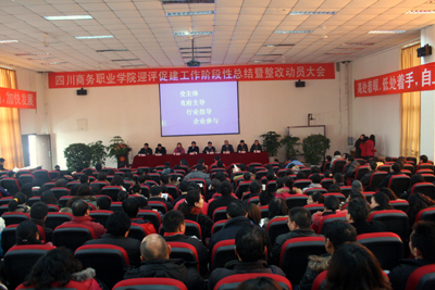 最后,学院党委书记舒维霖同志从党委和班子的角度作了重要讲话。他指出,学院全体教职员工首先要正确认识当前评建整改工作的重要意义 。其次要加强学习,更新观念,明确学院建设发展的奋斗目标。对于理论、文件和经验要善于把握住其精神实质和精髓,要“钻进去,跳出来 ”;大胆试,大胆闯,走出蕴含现代巴蜀文明,独具商科特色的现代高等职业教育之路;更新观念,要在遵循高等职业教育规律的基础上走出 具有学院特色的发展道路,找到适应区域经济和行业发展需要的高素质技能型的商科人才培养模式。第三,要明确在“十二•五”期间,力争明 后年内学院成功申办省级示范高职院校的目标,具体落实整改措施,加强领导班子和干部队伍建设以及师资队伍建设,调整和改革管理体制和 运行机制,强力推进学院二级管理,调动各系部的积极性,实施收入分配制度改革,构建多渠道投入机制,增强办学活力,提高积极性,保障 学院持续健康发展。最后,舒书记代表学院党委和班子作四点郑重承诺:要做团结奋进的模范,要做建设学习型组织的模范,要做真抓实干, 率先垂范的模范,要做廉洁自律的模范。