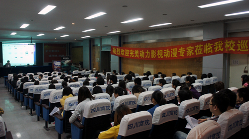 讲座由完美动力公司技术总监王磊主讲。本次讲座主要围绕CG短片作为一种时尚、一种展示自我思想的动画表现形式进行了阐述。随着视频网站的兴起,CG短片以其短小精悍的体裁,富含原创性、娱乐性、思想性的内涵,受到越来越多动画爱好者的推崇。完美动力一直主张原创作品,并致力于优秀CG短片的制作与推广。以完美动力成都授权中心动画一班的学生作品《炮灰兔》之善待动物的片头动画为例,王磊先生还详细地讲解了制作动画的步骤,要求同学们认识并熟悉软件的动画制作方法以及动画控制面板,能制作出小球弹跳动画,为第二步的制作打下良好基础,目的也是让同学们掌握在三维软件中应用平时所学的《动画原理》。通过对短片中的跑步动画制作原理的详细分析,以及生动有趣、身体力行的展示让同学们进一步理解跑步中的POSE,同时初步理解动画中的最重要的知识之一节奏,并拓展讲解了制作要点节奏的掌握对动画的影响。