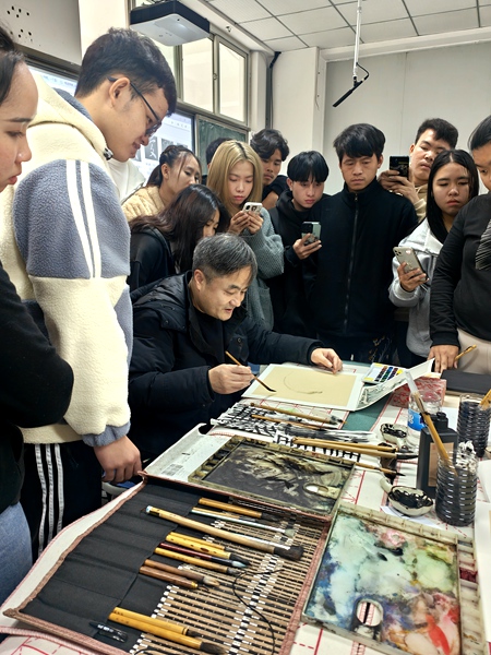 12月14日下午,继中国书法讲座后,成都锦城学院范美俊教授又为万象城留学生作了题为“中国画赏析与实践”的讲座。范美俊用深入浅出的语言,引领留学生领略了中国画的深厚内涵和独特魅力。他通过现场演示和讲解,展示了中国画在构图、线条、色彩等方面的独特之处,让留学生对中国画的魅力有了更深入的了解。留学生们也跃跃欲试,表现出了深厚的兴趣。他们在范美俊的指导下,将自己对中国传统文化的理解和热爱凝聚在笔尖,展现于画纸,创作出了一幅幅朴拙的作品。