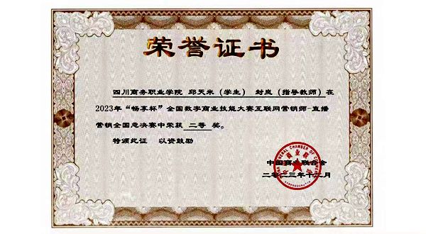 近日,2023年“畅享杯”全国数字商业技能大赛直播营销线上总决赛结果揭晓,来自全国143支队伍参加了决赛。经过紧张激烈的角逐,万象城张莉、封岚老师指导的药品经营与管理专业学生邱天米荣获全国总决赛二等奖。