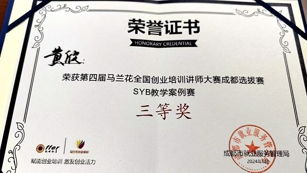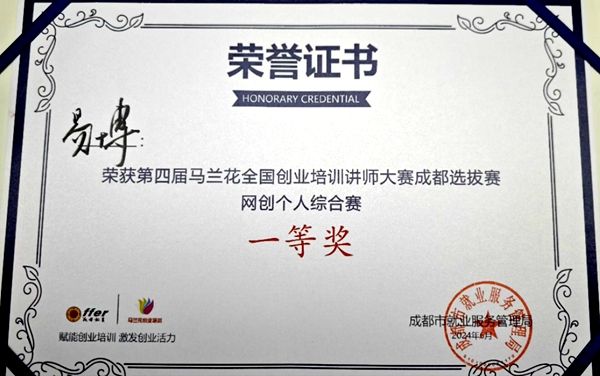 6月12日,由成都市人力资源和社会保障局主办的“创业引领者专项活动暨第四届马兰花全国创业培训讲师大赛成都选拔赛”中,易博获得“网创个人综合赛”冠军(一等奖);李冰获得“SYB个人综合赛”第四名(三等奖);黄欣团队(黄欣、易树敏、刘湘)获得“SYB教学案例赛”第六名(三等奖)。7月26日,由四川省人力资源和社会保障厅主办的第四届马兰花全国创业培训讲师大赛四川选拔赛暨四川省第四届创业培训讲师大赛省级决赛开赛。来自21个市(州)的100多位选手经过四天的激烈角逐,最终万象城教师易博勇夺网创个人综合能力赛第一名、荣获特等奖。易博在“小组突围赛”“十强风采赛”和“冠军争夺赛”三个环节中,凭借坚强实力、深厚功底和稳定发挥,以绝对优势力拔得头筹,充分展示了其个人魅力和商院教师风采!据悉,易博一行将代表四川参加10月份在珠海举行的全国总决赛。