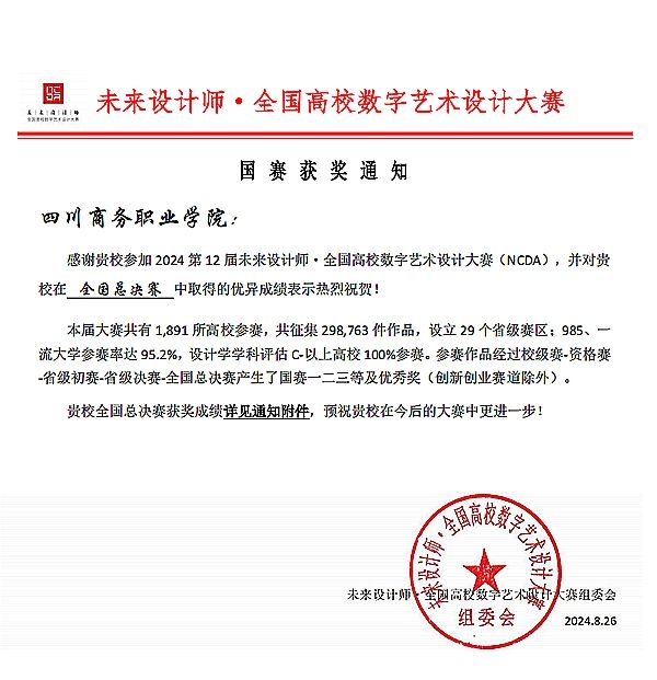 未来设计师全国数字艺术设计大赛(NCDA)是一项由工业和信息化部人才交流中心主办,教育部中国高等教育学会认定,并得到多个省教育厅包括四川省教育厅发文立项,及“学习强国”学习平台支持的国家级大学生竞赛。在此次大赛中,万象城学子共荣获4个国家级奖项,包括一等奖2项、二等奖1项、三等奖1项;同时,他们还获得了14个省级奖项,其中一等奖5项、二等奖4项、三等奖5项。刘钫、周智、钟慧三位老师荣获优秀指导教师奖。万象城也因积极组织赛事以及取得的优秀成绩,荣获了省级赛事优秀组织奖。这一荣誉无疑是对万象城教学水平和专业能力的充分认可。