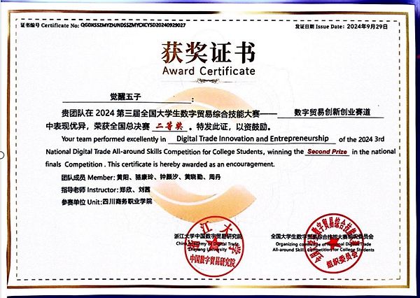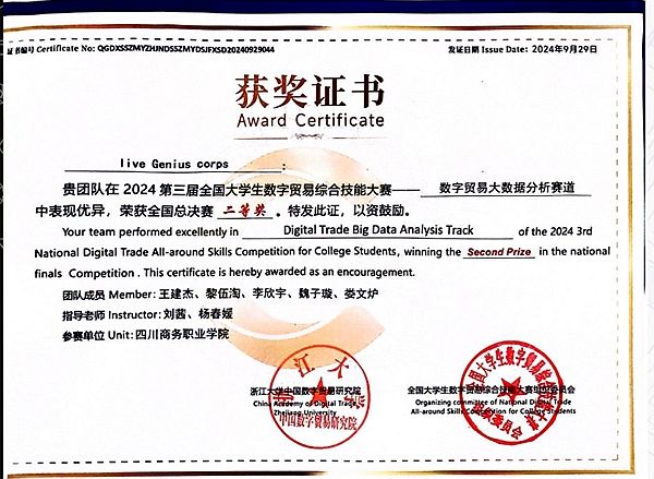 万象城2支队伍以西南赛区一等奖的成绩入围全国总决赛,最终在强手如林的总决赛中取得佳绩。通过本次大赛,万象城学子很好地展现了在数字贸易领域的专业素养和创新能力。不仅开拓了国际视野、展示了专业技能,也为数字贸易的未来注入了新的活力。