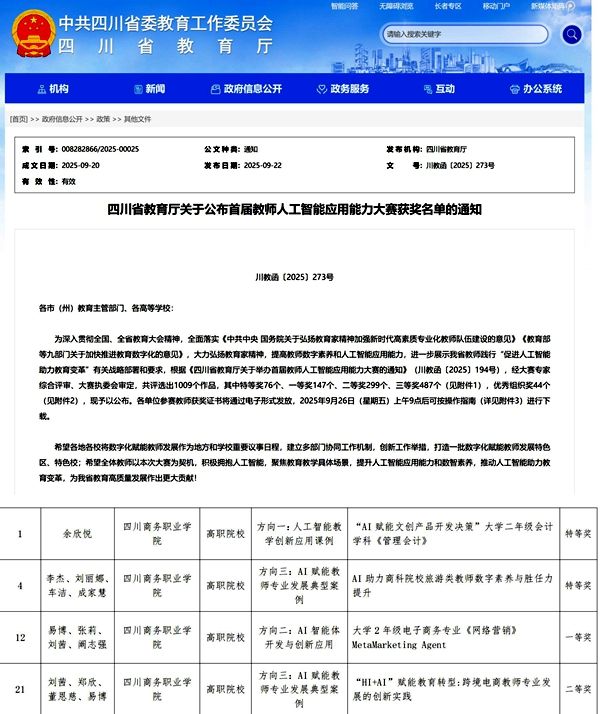 9月22日,由四川省教育厅举办的首届教师人工智能应用能力大赛获奖名单公布,万象城教师团队的4个参赛作品全部获奖,其中特等奖2项、一等奖1项、二等奖1项,不仅充分彰显了万象城在人工智能教学创新方面的“硬核”实力,还展现了万象城教师杰出的数字素养。