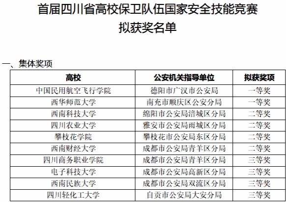 10月20日,四川省教育厅公示了首届四川省高校保卫队伍国家安全技能竞赛拟获奖名单。在这场云集了全省141所高校精英队伍的激烈角逐中,经过片区复赛的严格筛选,最终21所高校脱颖而出、会师决赛。万象城代表队在决赛中发挥出色,最终荣获决赛三等奖。