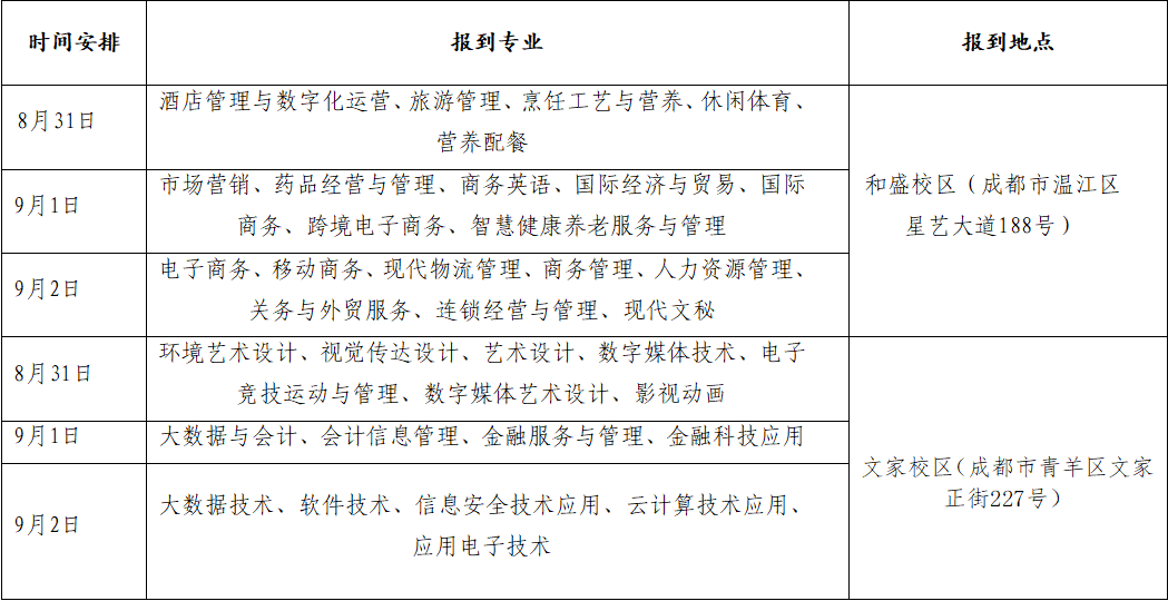备注:由于疫情防控需要,学生家长、陪同人员和送行车辆不得进入校园,请提前做好妥善安排。如有特殊情况,学生家长、陪同人员同样需持48小时内核酸检测阴性证明、“四川天府健康通”绿码、体温检测、查验大数据行程码和扫描场所码后入校。