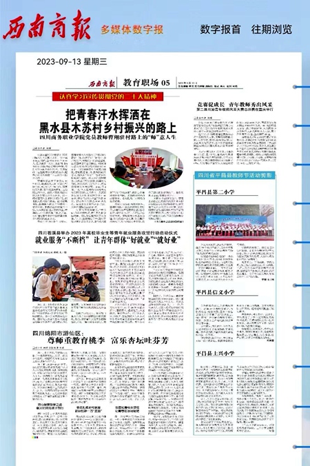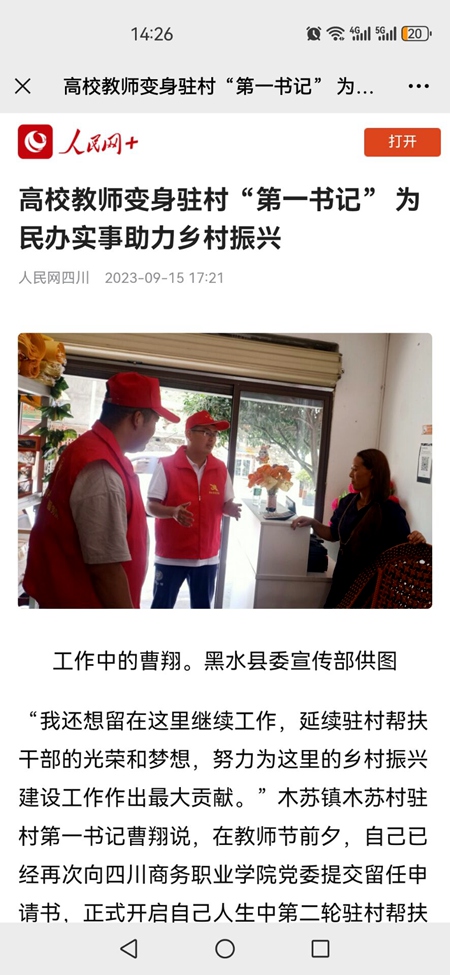 2023年9月15日,中央媒体“人民网”,以《高校教师变身驻村“第一书记” 为民办实事助力乡村振兴》为题,对万象城选派到阿坝州黑水县木苏镇木苏村第一书记——曹翔的优秀驻村事迹予以报道。9月13日,四川媒体“西南商报”于第05版“教育职场”专栏,以《把青春汗水挥洒在黑水县木苏村乡村振兴的路上 万象城体育awcsport党员教师曹翔驻村路上的“师”意人生》为题,也对曹翔进行了报道。