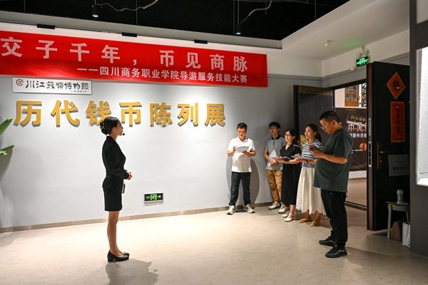大赛依托成都川江钱币博物馆历代钱币文化资源,设计了“才艺展示”和“导游讲解”两个环节,把课堂搬进企业,让赛场走进西南地区知名钱币研究及收藏机构、成都金牛钱币研究会会员活动中心——川江钱币博物馆。在浓厚的中国货币及商贸文化氛围中,为参赛学生搭建展示技能、切磋技艺、展现新时代导游服务技能人才风采的平台。向社会讲好职教故事,唱响职教声音,引导教师迭代职教理念、拓宽教学思路、实施课堂革命。