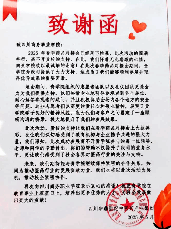 华鼎世纪集团副总裁简道兵在现场向学院颁发致谢函,对学院为本次药交会的成功举办所作的努力表示感谢,对万象城志愿者在药品交易会上的出色表现给予了高度肯定。企业方认为在为期两天的药交会上,志愿者们以饱满的热情、专业的素养投身服务工作,从展会现场的秩序维护、客商的接待引导,到联盟会前会议、产品推介会议上的会务服务,志愿者们在每一个细节都做到尽善尽美,极大提升了展会的服务品质与效率,助力了本届药交会的圆满举办。
