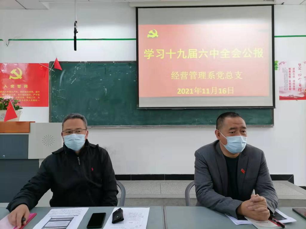 为更好地贯彻落实学习十九届六中全会精神,11月16日下午2:00,经营管理系党总支按照学院部署和要求,在1教202教室召开全系党员大会,集体学习《十九届六中全会公报》、《中共中央关于党的百年奋斗重大成就和历史经验...