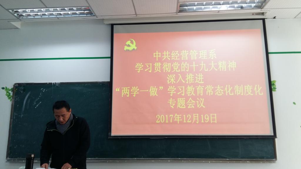 2017年12月19日下午两点整,经营管理系党总支全体党员于第一教学楼202室召开学习贯彻党的十九大精神深入推进“两学一做”学习教育常态化专题会议,会议由系党总支书记郑海波主持。 一、认真学习十九大精神,部署推进...