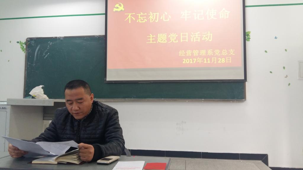 2017年11月28日下午两点整,经营管理系党总支全体党员于第一教学楼202室开展“不忘初心,牢记使命”主题党日活动,活动由系党总支书记郑海波主持。 一、认真学习学院关于认真学习宣传贯彻党的十九大精神通知 一)在郑...